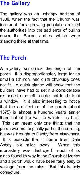 An earlier organ had been situated on a Gallery above the west end of the Nave. This was either removed during the major restoration of the Church in the first few years of the twentieth century, or the west Gallery had been taken down in 1838 when the new Gallery was constructed.